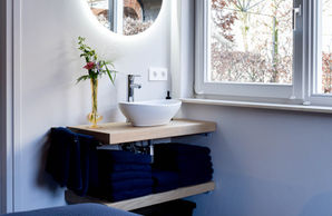 Slaapkamer met comfortabele opgemaakte bedden (standaard tweepersoons opgemaakt), douche voorzien van vloerverwarming met wastafel, apart toilet.